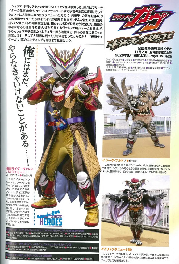 首先的话就是新骑士形态假面骑士Valen的芭菲模式了,这个的话是假面骑士瓦伦通过巧克力芭菲饱藏完成变身的强化形态,该形态以巧克力点心中堪称最高级的巧克力芭菲为设计原型,是兼具美学与力量的终极形态,与Gavv和Vram的最强形态同样冠以“模式”之称,其战斗力超越冰沙定制形态,威化饼干状的装甲能够阻断一切攻击。其次的话就是两个怪人的介绍,一个的话是伊吉克·布鲁托,其是出现在人间界的新砂糖人,拥有不逊色于Gavv的战斗力,使用类似驼鹿角的武器,与前总统博卡·贾尔达克有渊源,对博卡的遗孤莉泽露发起攻击,另一个的话就是谷古纳,其虽然单打独斗不算厉害,但和伊吉克配合起来超默契,俩人的联手攻击连主宰加布都将陷入苦战。总的来说,这次的V篇噱头还是非常足的,拥有两个怪人而且还是新砂糖人,值得期待一波。